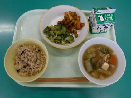 11月25日(木) 本日の給食 公開日 2021/11/25 更新日 2021/11/25 今日のひとコマ 今日の献立は、 ・ひじきご飯 ・牛乳 ・イカと豆のカレー揚げ ・グリーンサラダ ・豆腐スープ です。 イカがようやく捕れるようになり、久しぶりに給食に登場しました。