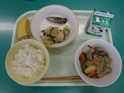 11月26日(金) 本日の給食 公開日 2021/11/26 更新日 2021/11/26 今日のひとコマ 今日の献立は、 ・ご飯 ・牛乳 ・豚肉の南蛮煮 ・鰯の梅煮 ・ゆず和え ・バナナ です。 わずかに辛みのある南蛮煮と、ゆずでさっぱり味の蕪の和え物の組み合わせが美味しかったです。