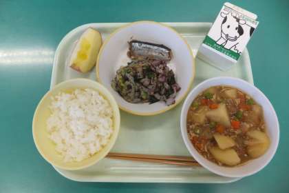 11月29日(月) 本日の給食 公開日 2021/11/29 更新日 2021/11/29 本日の給食 今日の献立は、 ・ごはん ・牛乳 ・さんまの生姜味 ・ゆかり和え ・じゃがいものそぼろあん ・りんご 今日の献立の食材には、秋の味覚の代表格とも言える秋刀魚が使われています。旬の食材を食べると元気が湧いてきます。