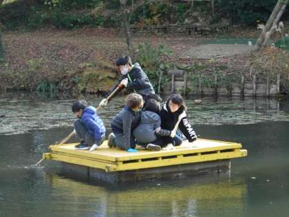 池に浮かんでいるいかだに乗りました。最初は、おっかなびっくりで、「落ちたらどうしよう。」「ふらふら傾くよ。」と言っていた子供たちでしたが、「〜さん、こっち来るとバランスとれるよ。」「竹の棒を、もっと強く押すと進むよ。」など、声をかけ合いながら、筏遊びを楽しんでいました。