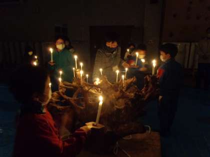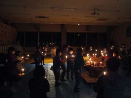 1日目の最後の活動として、キャンドルサービスをしました。静粛な雰囲気の中、上手にろうそくに火を灯し、落ち着いて火を見つめていました。
