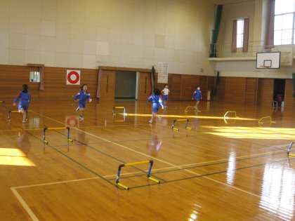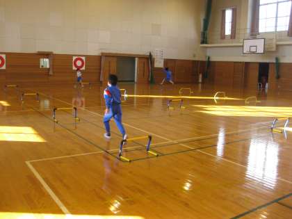 体育科「ミニハードル走」では、ミニハードルを使って、リズムよく走る練習をしています。子供たちはハードルとハードルの間を何歩で走ると速く走れるかを何度も走りながら、リズムをつかんでいます。