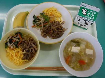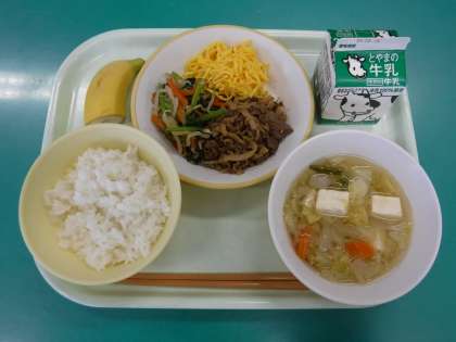 ・ご飯 ・ビビンバ(焼き肉・ナムル・錦糸卵) ・味噌汁 ・バナナ ・牛乳 です。