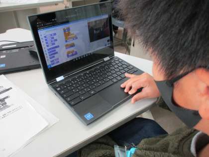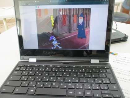 講師の先生をお招きし、2回目のプログラミング学習を行いました。前回と同様、スクラッチを使って学習しました。魔法使いのセリフを考えたり、お話の続きをプログラムを考えたりして楽しんで学習していました。