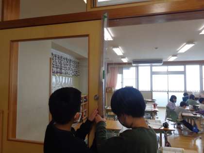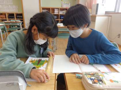 1月14日(金)4年生 算数「広さの表し方を考えよう」 公開日 2022/01/14 更新日 2022/01/14 4年生 算数「広さの表し方を考えよう」では、教室の机やドアの面積を求めました。縦と横の長さを協力して測り、素早く立式し、正確に答えを出すことができました。