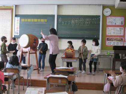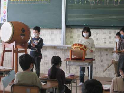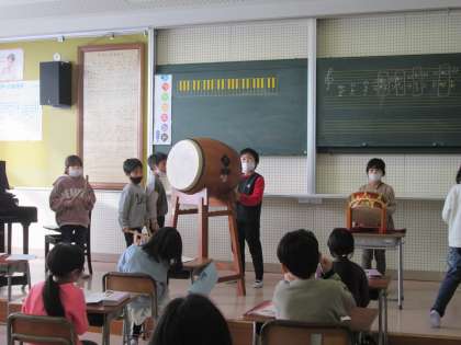 音楽科の学習では、「繰り返し」を使ってリズムを考え、太鼓や手拍子で発表しました。友達の考えたリズムを真似したり、「やーっ」とかけ声をかけたりするなど、楽しんで活動しました。