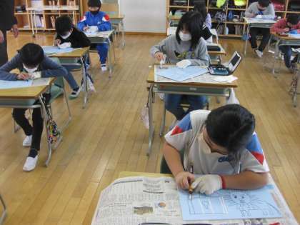 1月20日(木) 3年生 彫刻刀を使って 公開日 2022/01/20 更新日 2022/01/20 3年生 図画工作科では、彫刻刀を使って板を彫り、版画を作ります。3年生の子供たちは初めて彫刻刀を使いました。使い方に気をつけて、集中して彫ることができました。