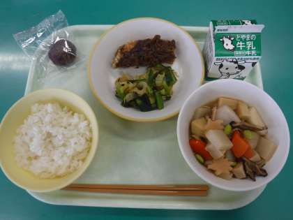 1月27日(木) 本日の給食 公開日 2022/01/28 更新日 2022/01/28 今日のひとコマ 今日の献立は、「旅館すずめや 〜てくてく遠足びより〜」のお話の中で、動物たちがが集めた山の幸や綺麗な山の景色をイメージして ・ごはん ・牛乳 ・魚のねぎ味噌かけ ・ゆず昆布和え ・吹き寄せ煮物 ・おはぎ でした。