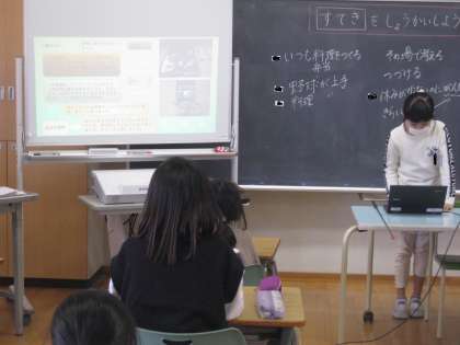 総合的な学習の時間では、老田のすてき(人のよさ)を調べてまとめました。子供たちは自分の家族に焦点を当てて、どんな仕事をしているのか、どんなことが得意なのかを紹介しました。家族のすてきをたくさん見つけています。