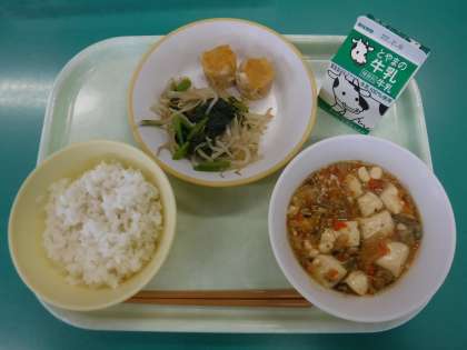 2月1日(火) 本日の給食 公開日 2022/02/01 更新日 2022/02/01 今日のひとコマ 今日の献立は、 ・ご飯 ・牛乳 ・麻婆豆腐 ・人参シューマイ ・おひたし です。 給食の麻婆豆腐は子供たちでも食べられるように辛くない味付けになっており、野菜もたっぷりで栄養満点でした。