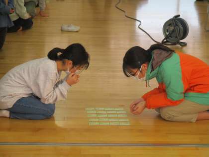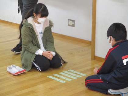 これまでの練習の成果を発揮しようと、いつも以上に集中して読み札の句を聞いていました。上の句で札をとる姿に成長を感じました。