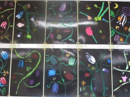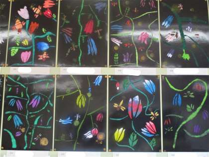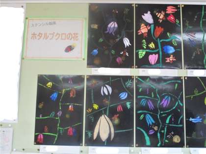 図画工作科の学習で、ステンシル版画を行いました。ホタルブクロの花をテーマに作成しました。紙を丁寧に切ったり、配色を考えながら着色したりしました。黒い台紙に鮮やかなホタルブクロの花がきれいです。