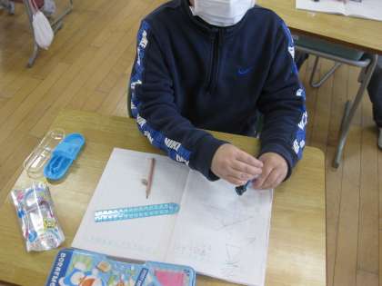 2月9日(水) 3年生 二等辺三角形を作図しよう 公開日 2022/02/09 更新日 2022/02/09 3年生 算数科「三角形を調べよう」の学習では、定規とコンパスを使って、二等辺三角形の作図をしました。コンパスで長さをうつしとり、交わる点を見つける作業に苦労していましたが、練習するうちに美しく描けるようになりました。