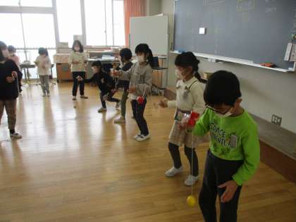 2月22日(火) 1年生 むかしのあそび〜けん玉・はごいた〜 公開日 2022/02/22 更新日 2022/02/22 1年生 生活科「むかしのあそび」の学習の時間に「けん玉」と「はごいた」にもチャレンジしました。初めてさわった子供もいて、「難しい」「コツがありそうだね」と話しながら楽しみました。
