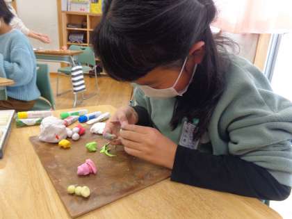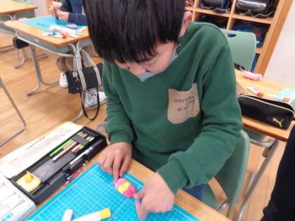 図画工作科の学習では、紙粘土を使って「元気のおまもり」を作りました。手に絵の具をつけながらも、紙粘土に絵の具を一生懸命に混ぜ、おまもりを完成させていました。