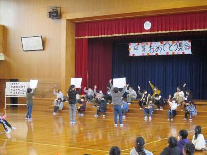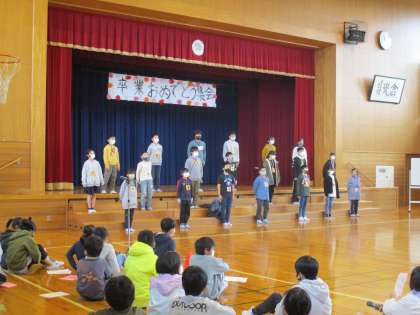 6年生の卒業をお祝いする集会を行いました。6年生に感謝の思いが伝わるように、姿勢や拍手、メッセージカード等で気持ちを表しました。6年生はお礼に歌を披露しました。すてきな集会になりました。