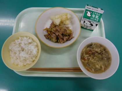 3月14日(月) 本日の給食 公開日 2022/03/14 更新日 2022/03/14 今日のひとコマ 今日の献立は、 ・ご飯 ・牛乳 ・豚肉のキムチ炒め ・粉ふきいも ・卵ともずくのスープ です。 キムチ炒めは、辛みがマイルドで、低学年にも優しい味でした。