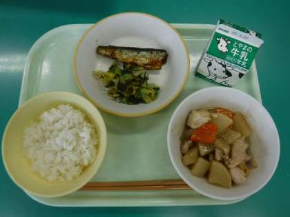 ・ご飯 ・牛乳 ・鶏肉と根菜の胡麻煮 ・鰯の生姜味 ・昆布和え です。