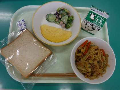 ・減量食パン ・牛乳 ・焼きそば ・オムレツ ・ビーンズサラダ ・ポケットチーズ です。