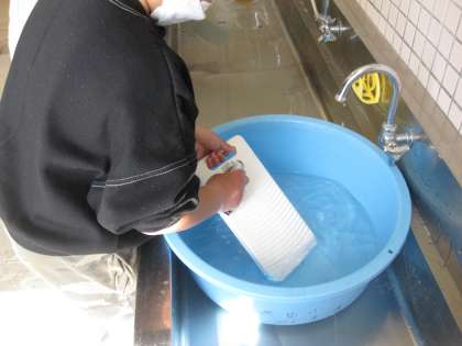 3月16日(水) 3年生 昔のくらし体験 公開日 2022/03/17 更新日 2022/03/17 3年生 社会科「市の様子と人々のくらしのうつりかわり」の学習では、昔の道具の一つ、「洗濯板」を使って洗濯を体験しました。子供たちは体験することで、一つ一つを手洗いしていたことの大変さを感じていました。