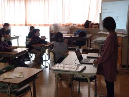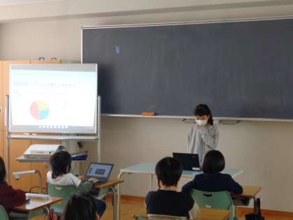 3月23日(水)4年生 国語 公開日 2022/03/23 更新日 2022/03/23 4年生 国語科「生活調査隊」の学習では、生活にある疑問をクロムブックのアンケートで調査し、調べて分かったことをスライドを使って発表しました。