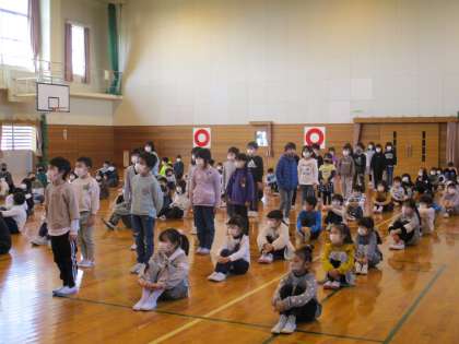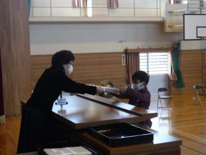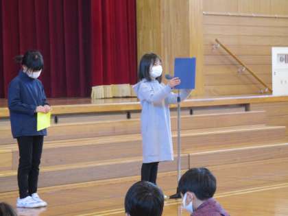 修了式では、2年生の代表児童が書初大会やなわとび大会等、3学期がんばったことを発表しました。その後、校長先生から修了証を受け取りました。2年生は全員で声を揃え、大きな声で返事をすることができました。この1年で心も体も大きく成長しました。