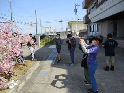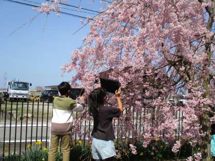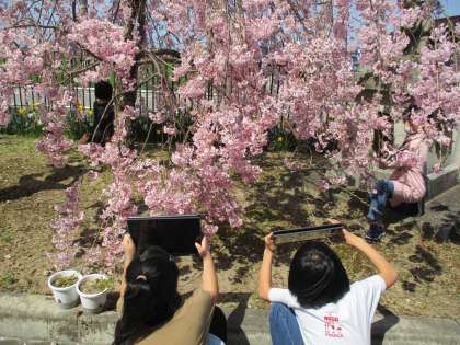 学校の桜が散る前に、桜のスケッチをしました。子どもたちはタブレットのカメラ機能を使い、いろいろな角度からアップやルーズ構図を考えていました。