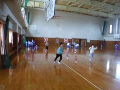 体育館でリレーをしたり、ドッジボールをしたりして元気に運動しています。