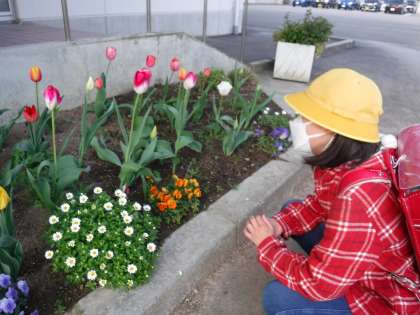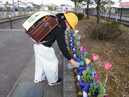 「おはよう。咲いたね。昨年植えたチューリップ!」