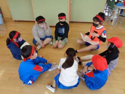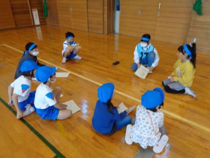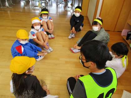 なかよし班ごとに集まって、自己紹介やそうじの確認、なかよし遊びを行いました。1年間、一緒に活動する仲間との仲を深めました。