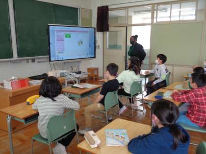 4月21日(木) 4年生 外国語活動 公開日 2022/04/21 更新日 2022/04/21 4年生 外国語活動では、世界の国の挨拶を学んでいます。子供たちは様々な国の言葉で挨拶をしてみようと、注意深くALTやビデオ教材から聞こえてくる声を聞き取り話していました。インドネシアでは挨拶をするときに両手を合わせています。活動する中で、挨国によって挨拶に使う言葉やジェスチャーには違いがあるということに気付いていました。