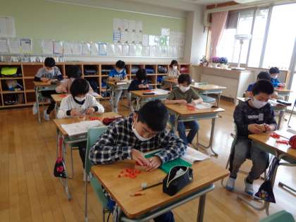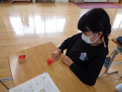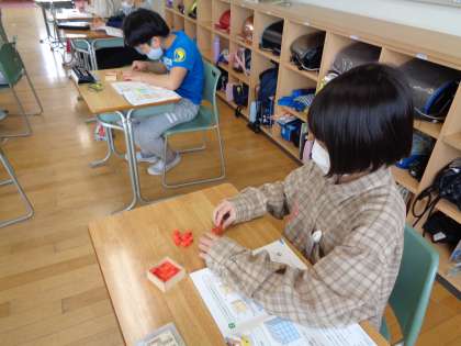 算数科の学習では、直方体や立方体のかさのあらわし方を学習しています。今日は1㎤の積み木を用いていろいろな直方体の体積を調べました。直方体の体積はたて×横×高さの計算で求めることができると学習できました。