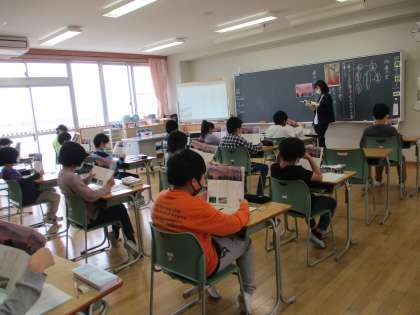 学習参観では、「枕草子」につづられている、春の風景を参考に自分たちが感じる春らしいものや様子について、「春は〇〇」から始まる文章に書き表しました。普段の音読の様子や真剣に学習に取り組む姿を家の人に見てもらうことができました。