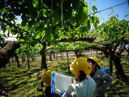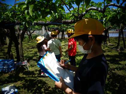 総合的な学習の時間では老田のすてきをみつける学習をしています。「米と梨の里 老田」では、いくつもの梨畑を見つけることができます。今日は庄司梨園に行って梨作りのすてきを探してきました。