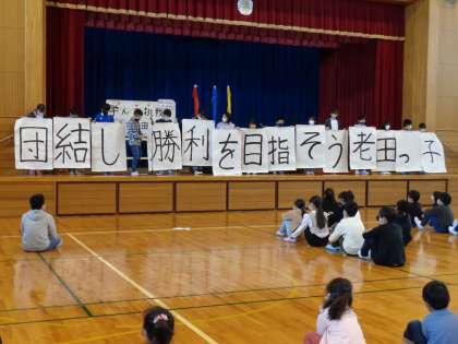 5月9日(月) 運動会スローガン発表 公開日 2022/05/09 更新日 2022/05/09 輝け!老田っ子 運動委員会は、運動会のスローガンを発表しました。今週から運動会の練習が本格的に始まります。みんなで力を合わせて、全力を出し切れる運動会にしていきます。