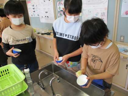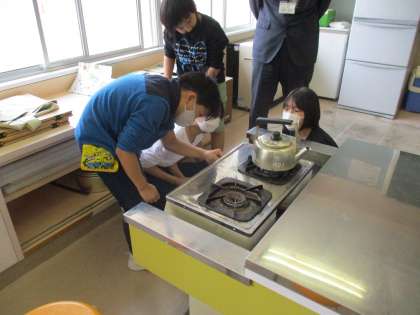 初めて家庭科室で、ガスコンロを使用し、お湯を沸かしました。一人ずつ順番にガスの元栓を開け閉めしたり、点火をして火の調節をしました。使う食器も丁寧に洗いました。
