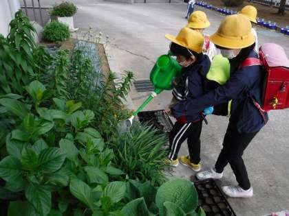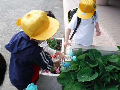 1年生がアサガオに水やりをしていたら、次々に登校してきた子供たちも花壇に水やりを始めました。