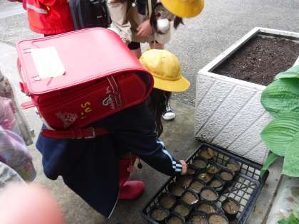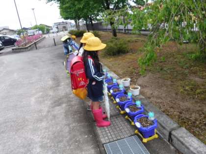 昨日からの雨で水やりはしなくてよいけれど、「おはよう」「早く芽がでてね」と声をかけていました。