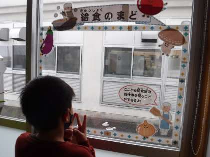 新しくできた窓に気付いた子供たちは、早速、そこから見える調理員さんの働いておられるところやたくさんの食材を見ていました。