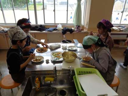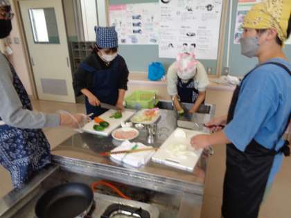家庭科の学習で、調理実習を行い、野菜炒めを作りました。にんじん、玉ねぎ、ピーマン、ハムを食材に合わせた切り方で調理しました。火の通りをよく見極め、おいしく作ることができました。