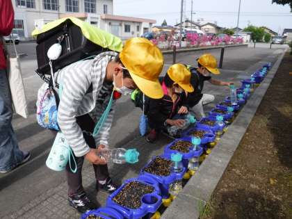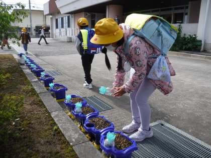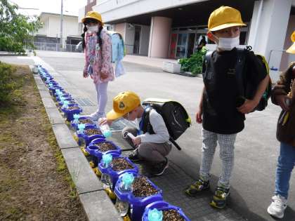 5月16日(月)Myあさがお、Myヒマワリに 公開日 2022/05/16 更新日 2022/05/16 メール用カテゴリ 1年生、3年生の子供たちの鉢やポットが児童玄関前にあります。 登校したばかりの子供たちが、アサガオの様子をすぐに見に行きます。 水をやったり、話しかけたりしていました。 今日、芽を出したアサガオもあるようです。 「お誕生日は、みんなばらばらだね」と言っていました。 子供たちは、マイあさがお、マイヒマワリの芽が出る日を楽しみにしていました。
