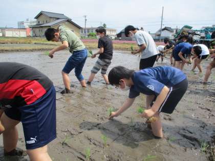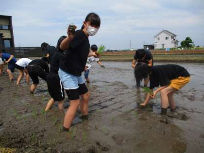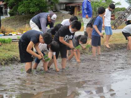 説明を聞いた後は、自分たちで植える体験を行いました。はじめは裸足で入る泥の感触や姿勢の保持に戸惑っていましたが、地域の方のご指導の下、自分たちの手で一列ずつ植えていくことができました。