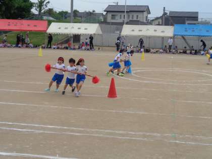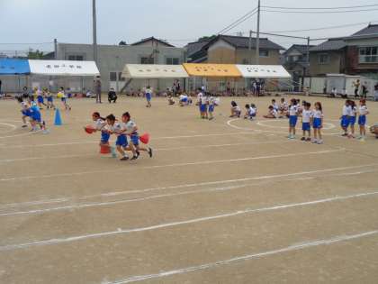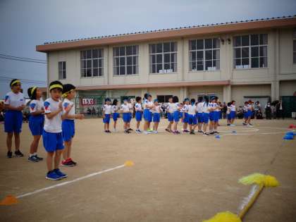 「台風の目」では、3・4年生が協力して、グラウンドをぐるぐると駆け回り、力強い風を巻き起こしました。どの色団も元気に全力で走っていました。
