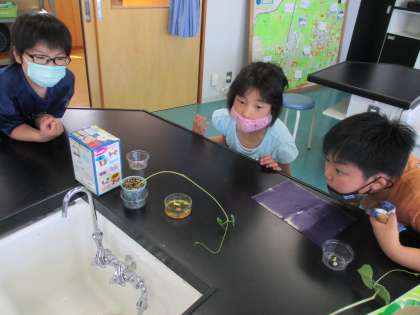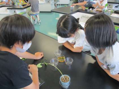 5月30日(月) 5年生 理科 公開日 2022/05/30 更新日 2022/05/30 5年生 インゲンマメが発芽する前後の子葉に、でんぷんが含まれているかを調べる実験をしました。うすめたヨウ素液にひたして、青むらさき色に色が変わっていく様子を観察しました。班で協力して準備片付けもできました。
