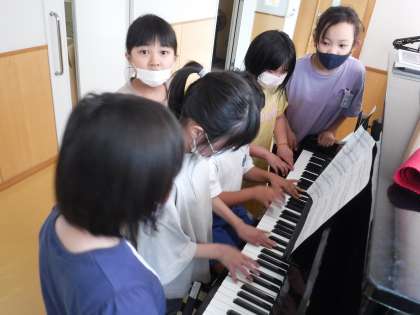 お昼休みには、廊下ピアノも人気です。友達と一緒にいろいろな曲にチャレンジしています。