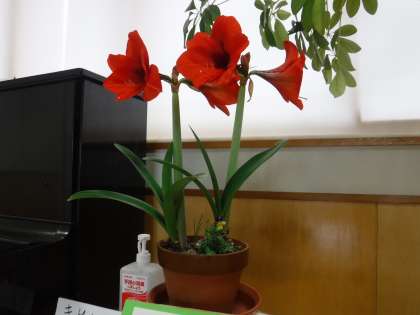 6月2日(木)地域の方から 公開日 2022/06/03 更新日 2022/06/03 メール用カテゴリ 教育ボランティアの方が美しいアマリリスを持ってきてくださいました。 大きな深紅の花を咲かせています。 早速、ピアノの横に置きました。 花を愛でながら「アマリリス」を弾きたいですね。 学校に温かいお心を寄せてくださり、ありがとうございました。