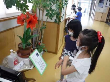 地域の方からのお花を見て、「すごいね、大きい花だね」「すごく赤いね」「茎が太くてまっすぐだね」・・・。アマリリスの前で話の輪が広がりました。