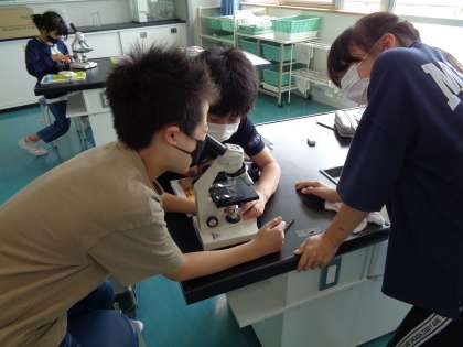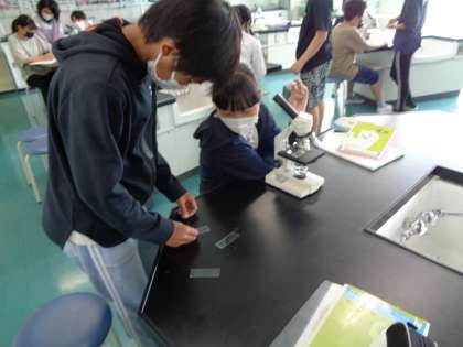 植物のどこを通って水が運ばれていくのかを調べました。色水を吸わせた植物の根や茎を切って、顕微鏡で観察しました。赤く染まっている様子を観察することができました。