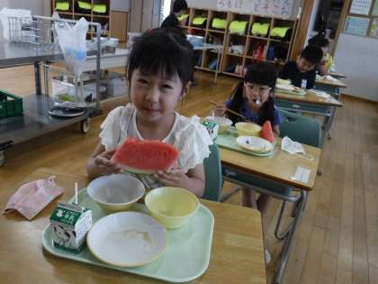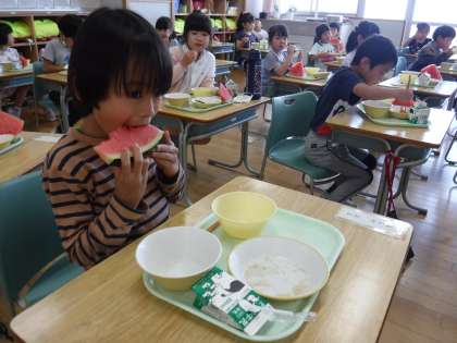 6月13日(月)今日の給食 公開日 2022/06/14 更新日 2022/06/14 本日の給食 今日の給食の献立は、 ごはん 牛乳 豚肉の塩麹いため キュウリもみ 味噌汁 スイカ 今年度初めて給食に「スイカ」が登場しました。子供たちは、給食の時間をとても楽しみにしていました。 とても甘くておいしいスイカに思わずにっこり! 明日の給食もお楽しみに。