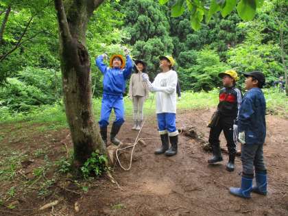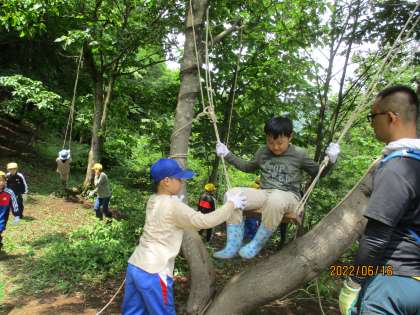 2日目の午前中はワイルド遊びを行いました。様々な長さのロープや枝を組み合わせて、自分たちで遊びを考えました。